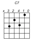 Je speelt meestal vijf snaren. Door de open snaren klinkt C7 helder en herkenbaar.